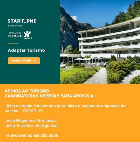 CANDIDATURAS ABERTAS PARA APOIOS A:Linha de apoio à tesouraria para micro e pequenas empresas do turismo – COVID-19Linha Regenerar Territórios Linha Territórios InteligentesFinanciamento até 300 000€SAIBA MAIS.