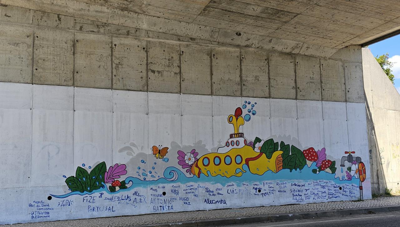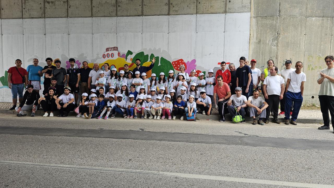 Orientados pelo artista local, David Fernandes, os utentes das instituições, crianças da Abutres Trail e crianças das escolas pintaram um mural inspirado na canção dos Beatles “we all live in a yellow submarine”, (vivemos num submarino amarelo), dando a ideia de que vivemos todos juntos, sem diferenças, sem preconceitos, num mundo cheio de cor e alegria. Foi este o mote para uma manhã de partilha extraordinária.